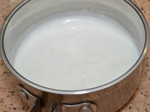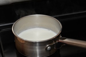 سخني الحليب حتى تبدأ الفقاعات في الظهور , أبعديه عن النار وأضيفي كربونات الصودا عليه