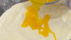 سخني الزبدة في قدر حتى تبدأ الفقاعات في الظهور, وصبيها فوق السميد والسكر , واخلطي الجميع بملعقة خشبية لكي تتوزع الزبدة.