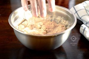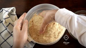 8- نعجنها حتى يتداخل الملح والماء داخل العجين