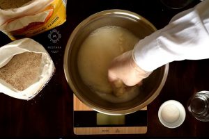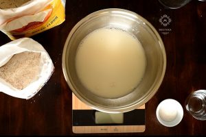 (Autolyse-الأتوليز)نغطيها ونتركها 30 دقيقة ترتاح ويتطور الجلوتين فيها