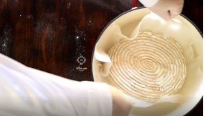 ننقل العجينة داخل السلة مع مراعاة ان تكون الأطراف المطوية للأعلى والسطح الاملس للعجينة للاسفل